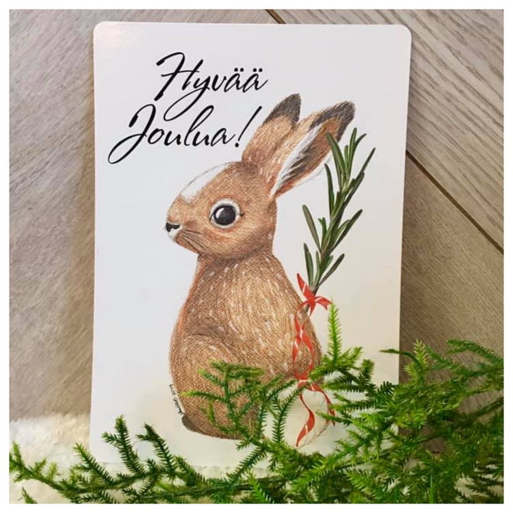 Jänön kuvalla varustettu joulukortti. Kortin taustapuolella on osoiterivistö sekä kirjoitustilaa joulutervehdykselle. Kortin pinta on kiiltävä ja reunat pyöristetyt.