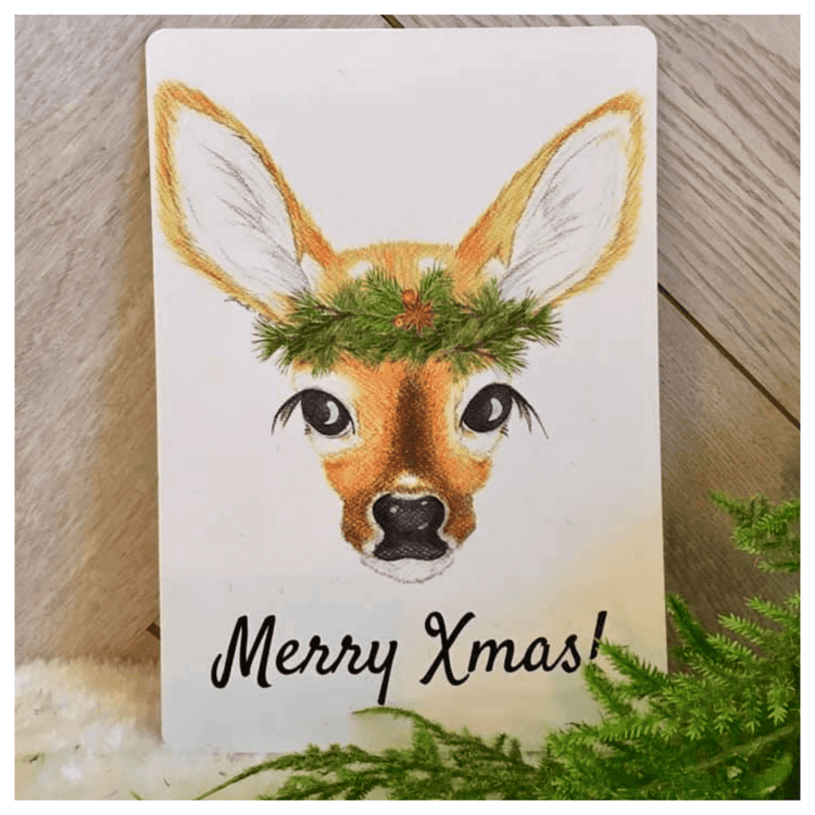 Kauriin kuvalla varustettu joulukortti. Kortin taustapuolella on osoiterivistö sekä kirjoitustilaa joulutervehdykselle. Kortin pinta on kiiltävä ja reunat pyöristetyt.