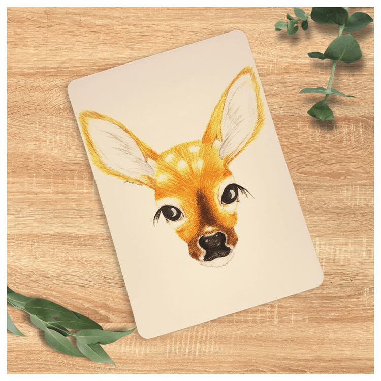 Kotimaisesta puuvärityöstä tehty kauris postikortti perinteisessä kokoluokassa. Taustapuolella osoiterivistö. Kortissa on mattapinta ja pyöristetyt reunat. Halutessasi voit itse kirjoittaa juuri sinunlaisen tervehdyksen korttiin mattapinnan ansiosta.