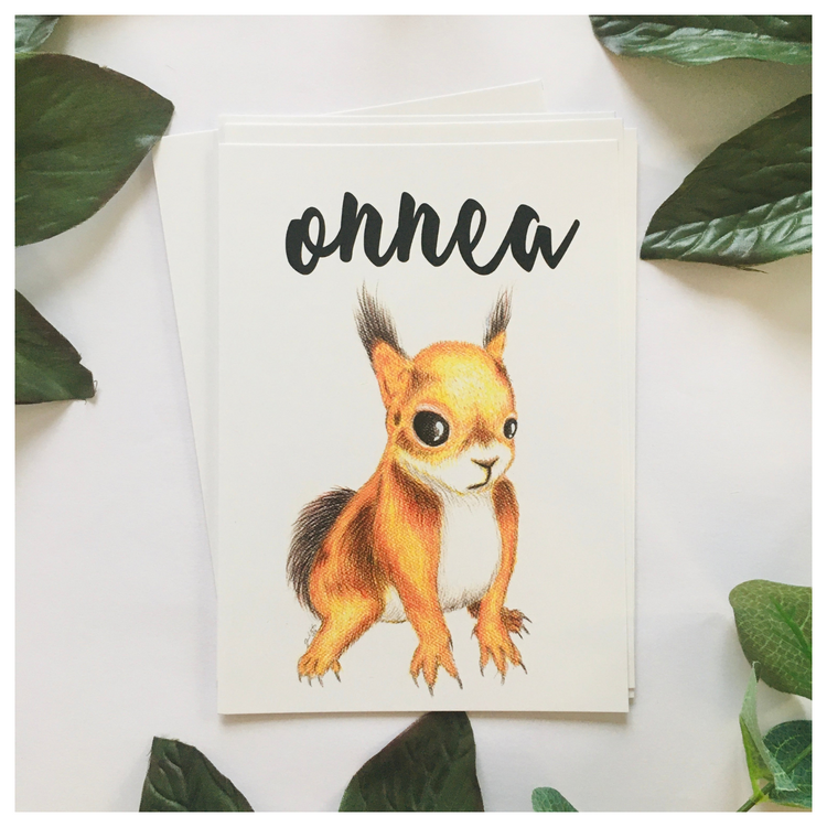 Suloinen Orava onnittelukortti. Yksittäin myytävät Orava-kortit ovat alkuperäisestä puuvärityöstä teetettyjä kortteja, jotka on painettu kiiltävä pintaiselle kestävälle kartongille. Taustapuolella perinteinen osoiterivistö. Koko A6