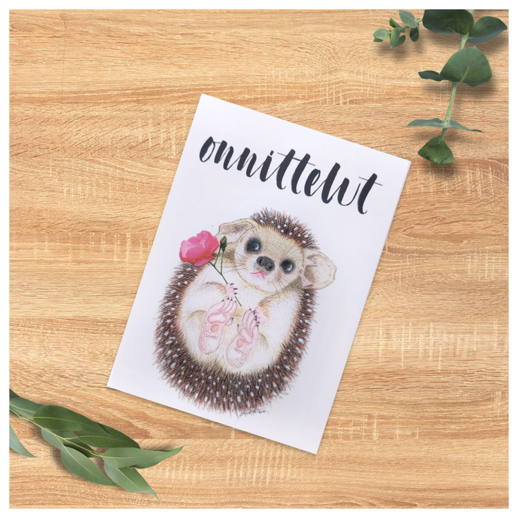 Suloinen Siili onnittelukortti. Yksittäin myytävä Siili-kortti on alkuperäisestä puuvärityöstä teetetty kortti, joka on painettu kiiltävä pintaiselle kestävälle kartongille. Taustapuolella perinteinen osoiterivistö. Koko A6
