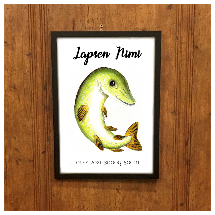 Suloinen Hauki-taulu myös lapsesi syntymätiedoilla! Kotimaisesta puuvärityöstä teetetty printti kiiltävällä valokuvapaperilla. Syntymätauluun tulevat lapsesi nimi, syntymäpäivä, pituus ja paino. Valitset vain haluamasi fontit valikoista ja kirjoitat Erityisohjeet myyjälle kenttään lapsesi nimen ja syntymätiedot.