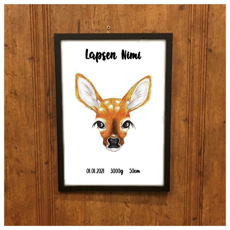Nyt voit tilata suloisen Kauris-taulun myös lapsesi syntymätiedoilla! Kotimaisesta puuvärityöstä teetetty printti kiiltävällä valokuvapaperilla. Valitset vain haluamasi fontit valikoista ja kirjoitat Erityisohjeet myyjälle kenttään lapsesi nimen ja syntymätiedot.