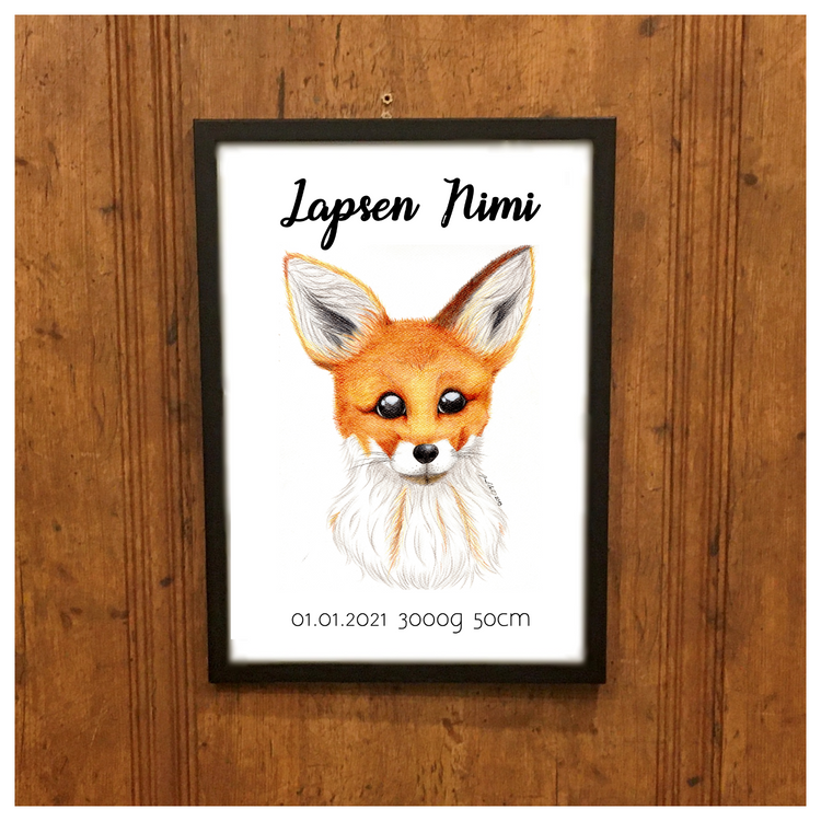 Nyt voit tilata suloisen Kettu-taulun myös lapsesi syntymätiedoilla! Kotimaisesta puuvärityöstä teetetty printti kiiltävällä valokuvapaperilla. Syntymätauluun tulevat lapsesi nimi, syntymäpäivä, pituus ja paino. Valitset vain haluamasi fontit valikoista ja kirjoitat Erityisohjeet myyjälle kenttään lapsesi nimen ja syntymätiedot sekä kehyksen värin.