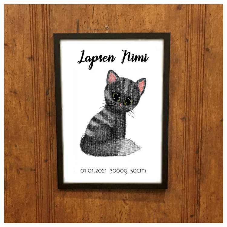 Suloinen Kisu-taulu myös lapsesi syntymätiedoilla! Kotimaisesta puuvärityöstä teetetty printti kiiltävällä valokuvapaperilla. Syntymätauluun tulevat lapsesi nimi, syntymäpäivä, pituus ja paino. Valitset vain haluamasi fontit valikoista ja kirjoitat Erityisohjeet myyjälle kenttään lapsesi nimen ja syntymätiedot.