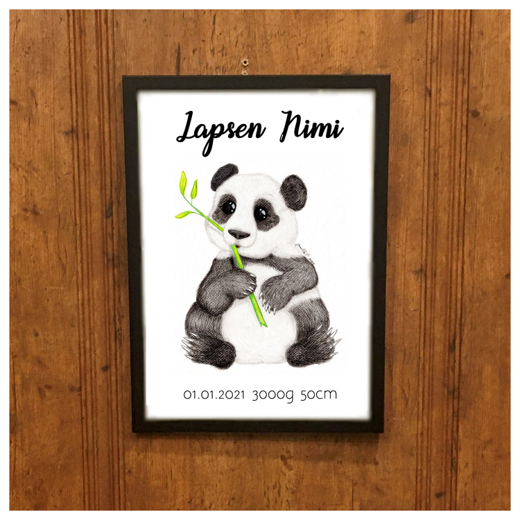 Nyt voit tilata suloisen Panda-taulun myös lapsesi syntymätiedoilla! Kotimaisesta puuvärityöstä teetetty printti kiiltävällä valokuvapaperilla. Syntymätauluun tulevat lapsesi nimi, syntymäpäivä, pituus ja paino. Valitset vain haluamasi fontit valikoista ja kirjoitat Erityisohjeet myyjälle kenttään lapsesi nimen ja syntymätiedot.