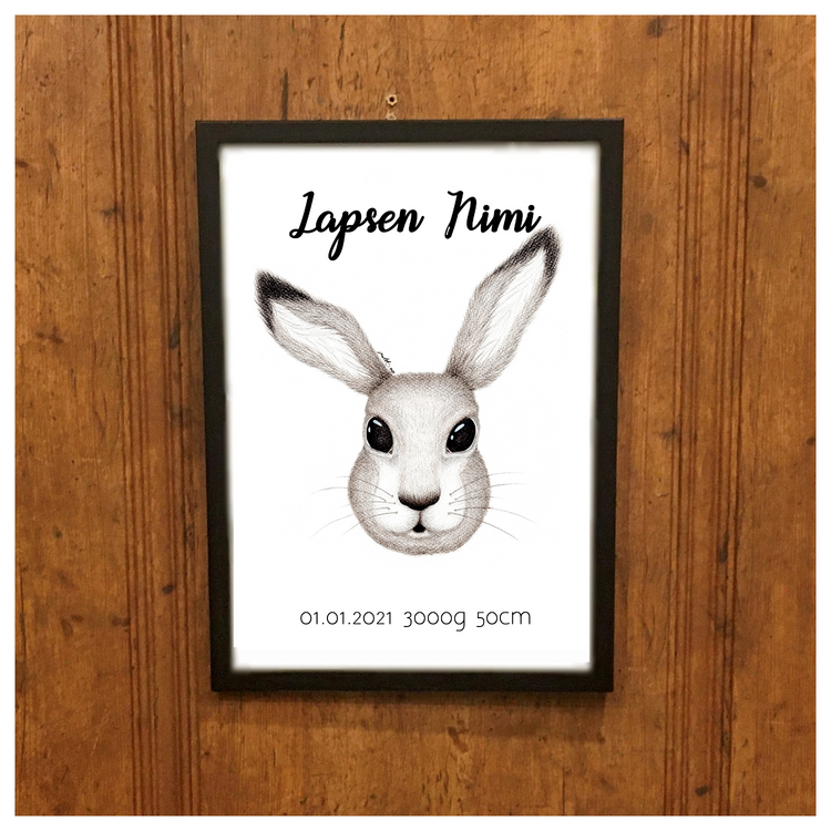 Nyt voit tilata suloisen Pupu-taulun myös lapsesi syntymätiedoilla! Kotimaisesta puuvärityöstä teetetty printti kiiltävällä valokuvapaperilla. Valitset vain haluamasi fontit valikoista ja kirjoitat Erityisohjeet myyjälle kenttään lapsesi nimen ja syntymätiedot.
