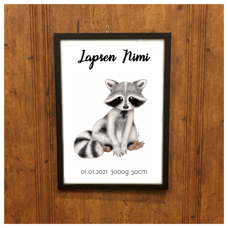 Nyt voit tilata suloisen Racoon-taulun myös lapsesi syntymätiedoilla! Kotimaisesta puuvärityöstä teetetty printti kiiltävällä valokuvapaperilla. Syntymätauluun tulevat lapsesi nimi, syntymäpäivä, pituus ja paino. Valitset vain haluamasi fontit valikoista ja kirjoitat Erityisohjeet myyjälle kenttään lapsesi nimen ja syntymätiedot sekä kehyksen värin.