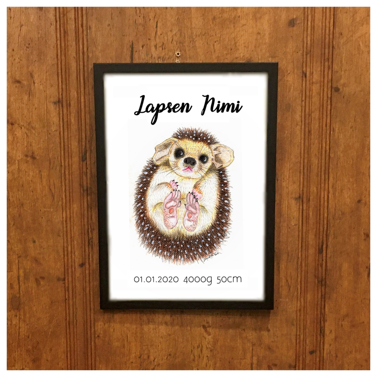 Suloinen Siili-taulu myös lapsesi syntymätiedoilla! Kotimaisesta puuvärityöstä teetetty printti kiiltävällä valokuvapaperilla. Syntymätauluun tulevat lapsesi nimi, syntymäpäivä, pituus ja paino. Valitset vain haluamasi fontit valikoista ja kirjoitat Erityisohjeet myyjälle kenttään lapsesi nimen ja syntymätiedot.